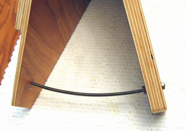 Once tightened down you simply bend the bolt at the nut on the top board so that the other end goes though the hole in the bottom board. The second problem is that the curve bolt traces a curved path through the bottom board that will cause binding. To fix this problem the hole in the bottom board (if not relieve cut as I did) should be counter-bored on the back side to about 1/8 inches from the top. The counter-bore should be large enough that the curve bolt doesn’t rub the wood there. Finally the hole in the bottom board should be only slightly larger than the bolt diameter. Be sure to use one washer under the gearnut too. Done correctly the curve bolt will swing freely though the bottom board with no noise or binding.