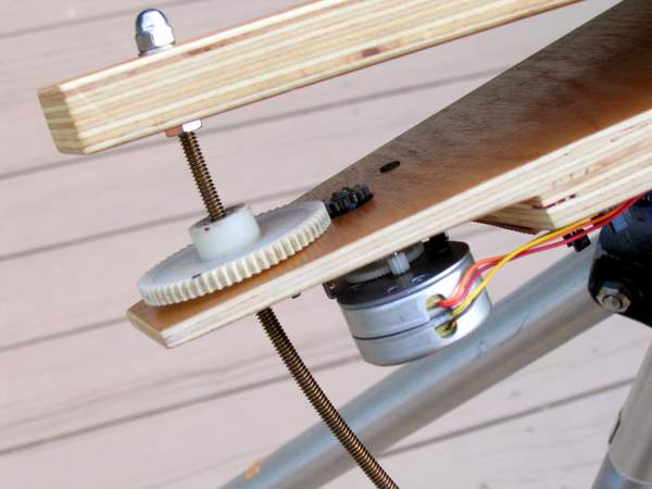 I wanted the gear nut to turn somewhere around 1 to 1.5 rpm. I found a 10 rpm timing motor with a 10 tooth spur gear and a 65 tooth mating gear giving 1.538 rpm, close enough! If I use a 32 thread per in. threaded rod that gives: 1436 min/day * (10/65 teeth * 10 rpm) / 32 tpi / 3.1416 /2 = 10.988 inch radius required for the curve bolt. I prefer a timing motor because it has less vibration than a stepper even though it runs off 110 volts AC. I’ll just use an inexpensive inverter that I have that cost only $20.