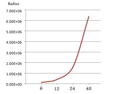 The fastest mirrors have the most residual error so the worst case scenario would be a mirror the same size as the flat and about f/2.5 (about the fastest ATM mirror). So if I want to be very conservative and say the maximum allowable error should be <= 1/100 wave for mirrors slower than f/2.5 then we will have the plot below as a radius of curvature in inches for our flat:
