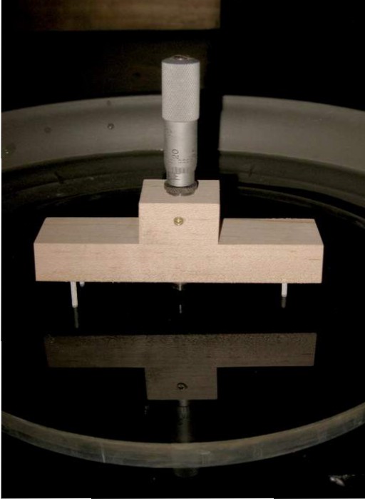 | This fixture is just a maple block with a hole drilled to fit a micrometer. Three aluminum nails are used as feet with the ends rounded off with a file. The micrometer has a ball tip and is zeroed on a known flat surface. |