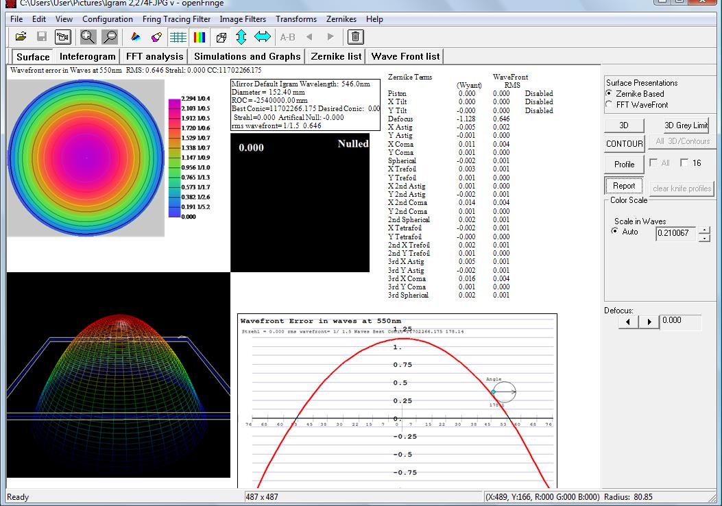 defocus in the Zernike table or it will be subtracted out automatically. This report is not of much use unless you can subtract a Zernike file of a true flat that has the number of fringes for the viewing distance and water thickness you measure. Lacking this Zernike file you can just look at the defocus value in the Zernike table. If your Interferogram is convex but is displayed as concave click the invert wavefront button. The interferogram analyzed in this example had 2.27 fringes of power and its Zernike defocus value is -1.128, very close to ½ the fringe value. You should work the flat until the defocus value is as close to ½ the calculated value as possible but again be careful of the +/- convex/concave sign convention. The longest viewing distance gives the fewest fringes and least error sensitivity to errors in the water thickness.